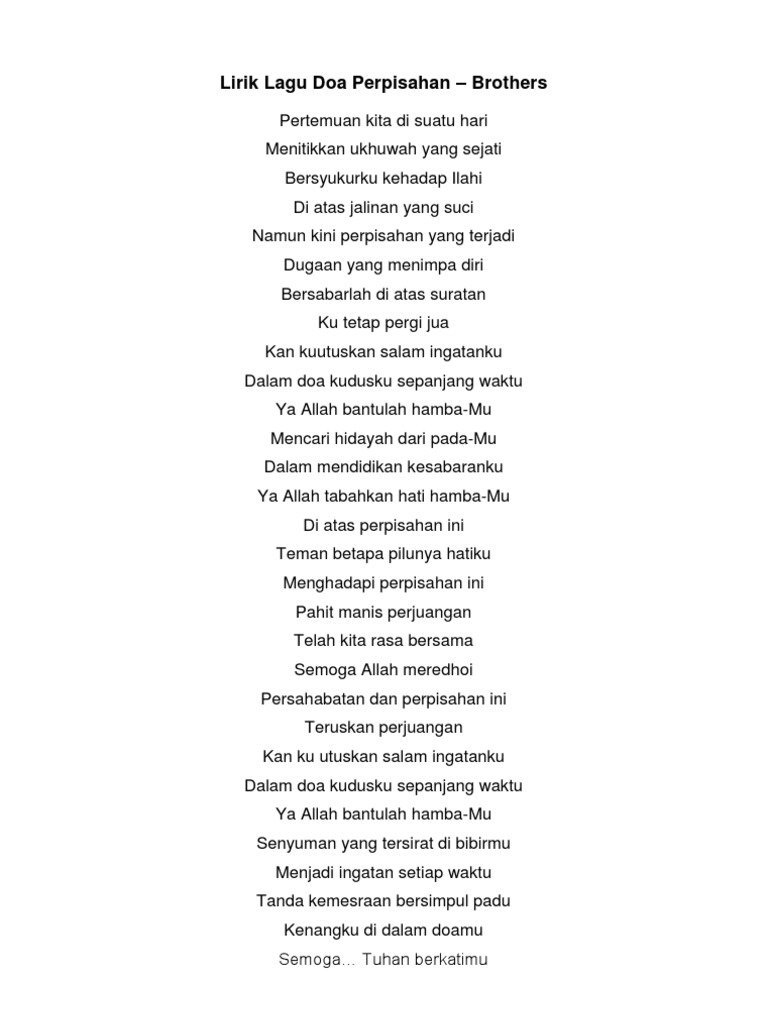 Perpisahan yang tak ku duga telah terjadi Dirimu pergi biar ku sendiri. Di sini bermulanya pertemuan yang terakhir Kehilangan amat terasa di hati Mungkinkah ini yang tertulis di tangan takdir Ku terima perpisahan ini. Lirik Perpisahan ini Aizat 1st Edition.
